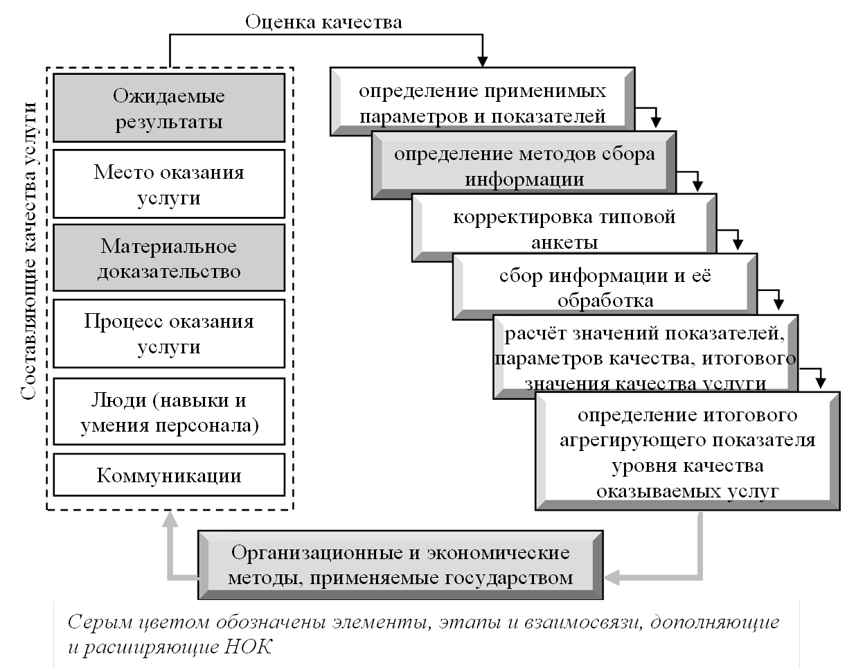 Процедура проведения НОК инициируется органом исполнительной власти, который формирует перечень организаций, подлежащий оценке. Для проведения оценки привлекается сторонняя организация – оператор, которая обеспечит сбор и обработку необходимых данных. Данные, полученные оператором, передаются на рассмотрение общественному совету, который формирует предложения по совершенствованию деятельности организаций социально-бытового обслуживания. Информация о результатах НОК размещается в информационно-телекоммуникационной сети «Интернет» (сеть Интернет) в открытом доступе [1].