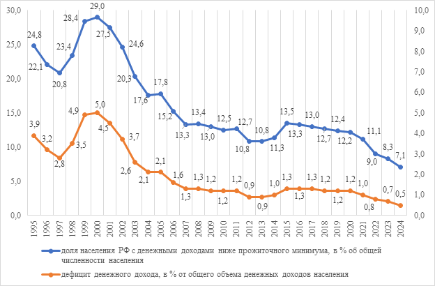 Рисунок 1 – Доля населения РФ с денежными доходами ниже границы бедности и дефицит денежного дохода за 1995-2024 гг.