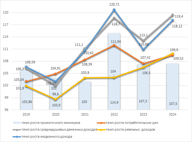 Рисунок 2 – Цепные темпы роста прожиточного минимума, потребительских цен, среднедушевых, медианных и реальных денежных доходов за 2019-2024 гг., в % [составлено автором по 19; 24; 25]