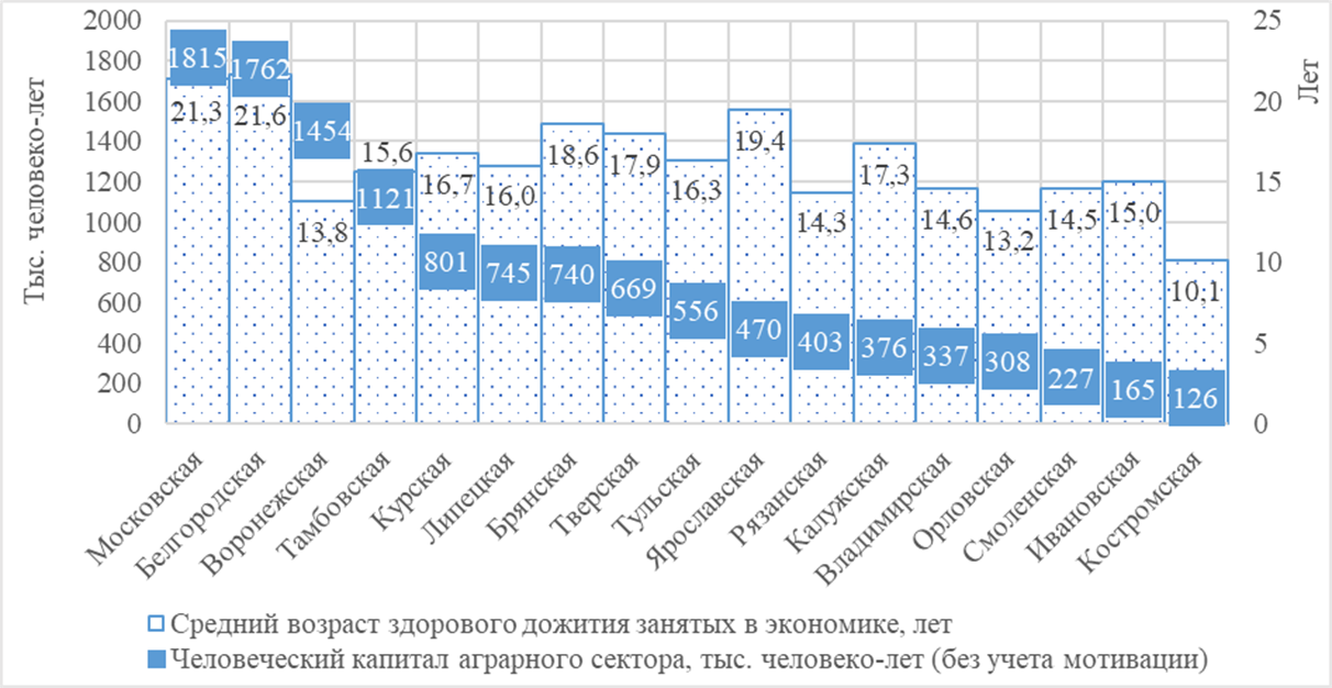 Показатели среднегодовой численности занятых по виду экономической деятельности (ВЭД) «Сельское, лесное хозяйство, охота, рыболовство и рыбоводство» [1], среднего возраста занятых в экономике и ожидаемой продолжительности здоровой жизни [2] в разрезе регионов ЦФО доступны в материалах Федеральной службы государственной статистики (Росстата). В основе выбора данных показателей лежит свойство неотделимости человеческого капитала от его владельца, работника сельского хозяйства региона. Поэтому при его расчете для любой экономической системы, в том числе аграрного сектора в регионе, необходимо учесть число активных носителей человеческого капитала, а также их возраст, поскольку полноценное воспроизводство человеческого капитала возможно только на протяжении здоровой жизни.
