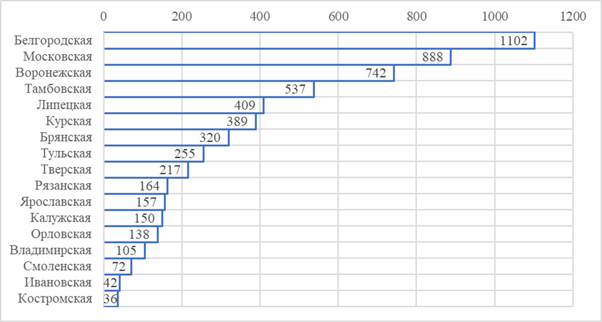 Рисунок 3 – Итоговый рейтинг регионов ЦФО по величине человеческого капитала аграрного сектора, тыс. человеко-лет [рассчитано и составлено автором]