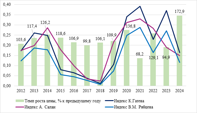 Наиболее интересны результаты за 2020-2024 гг. В пандемийном 2020 г. структура цены изменилась (уровень различий – существенный или значительный), цены выросли на 36,8%. В 2021 г. структура цены вновь изменилась, однако теперь её значение относительно предыдущего года снизилось. В 2022 г. национальная экономика столкнулась с усилением санкций – и вновь существенные изменения в структуре цены сначала сопровождались ростом её значения, а в последующем году – снижением. В 2024 г. структура мало чем отличалась от 2023 г., однако рост цен оказался наибольшим за весь рассматриваемый период.