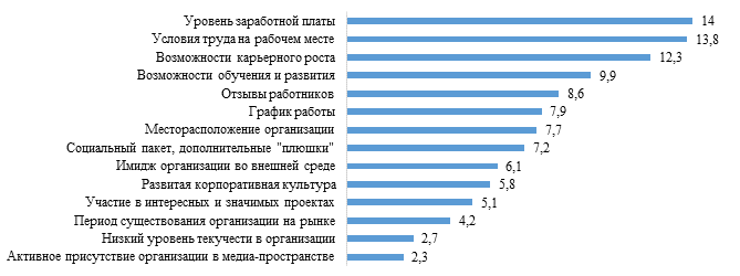 Рисунок 1 – Распределение факторов выбора работодателей молодежью НСО, % Источник: составлено автором