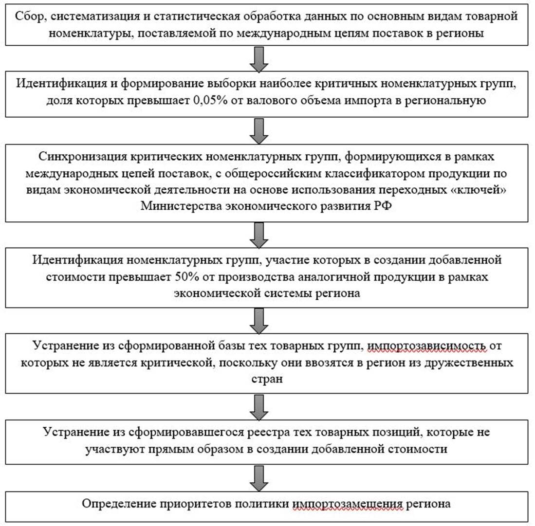 Методической основой исследования являются методы дескриптивного анализа данных по ключевым группам товарной номенклатуры, поступающей в ПФО через каналы международных цепочек поставок, сложившихся до санкций в 2022 году. Такой временной горизонт выбран из-за неполноты официальной региональной статистики после 2022 года, а также для анализа устоявшейся структуры российских экспортно-импортных потоков на фоне усиления санкционного давлении в тот период. Критичность товарных групп, импортируемых в регион, оценивается через сравнение объемов международных цепочек поставок с уровнем местного производства схожей продукции по каждой номенклатуре, что позволяет выявить уязвимость территории к зарубежным поставкам в ключевых товарных категориях, задействованных в процессах формирования добавленной стоимости (включая отдельные отрасли экономики региона). Особое место занимает учет страны происхождения импортируемой продукции: дружественная или недружественная, поскольку даже незначительные колебания в поставках продукции из недружественных стран могут оказать существенное влияние на устойчивость производственных процессов региона. Алгоритм идентификации критического уровня импорта с учетом страны происхождения и формирования на его основе приоритетов политики импортозамещения региона представлен на рисунке 1.