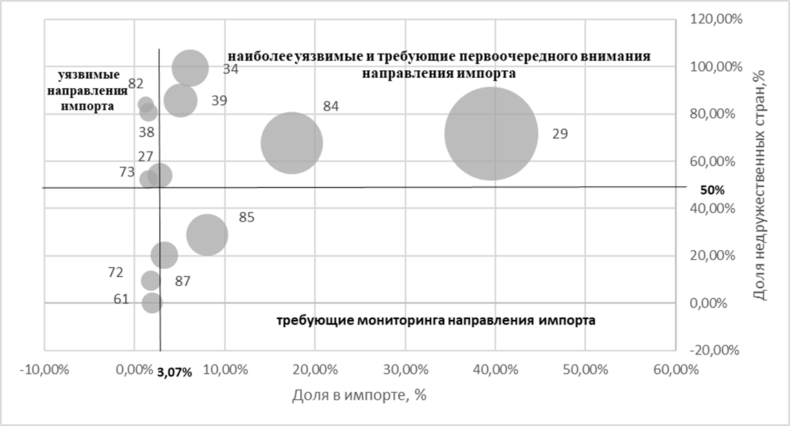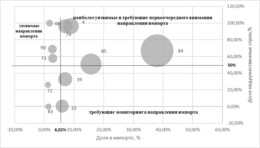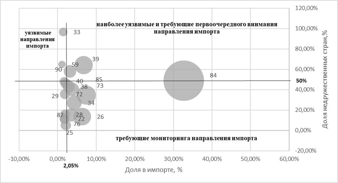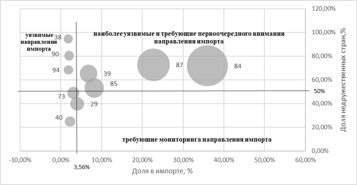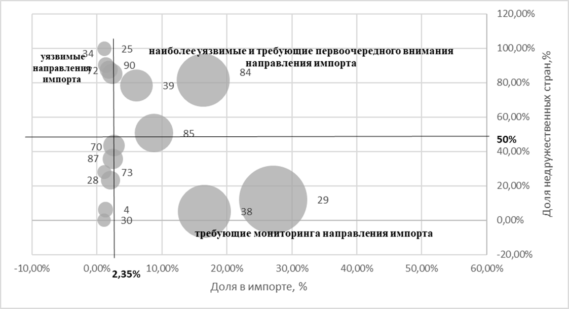 Сопоставив значения долей в импорте региона и долей поставок ТНВЭД из недружественных стран, на рисунках 2-15 представлены наиболее уязвимые направления в разрезе ТНВЭД. По данным направлениям в первую очередь необходимо активизировать политику импортозамещения, выбрав одну из подходящих стратегий: альтернативные поставки из зарубежных стран, альтернативные поставки из иных субъектов РФ, располагающими потенциалом к импортозамещению поставок, разворачивание локальных видов производств с учетом имеющегося ресурсного потенциала.