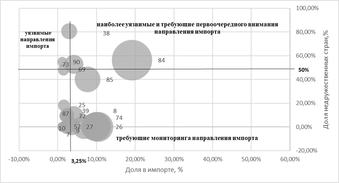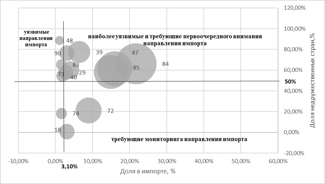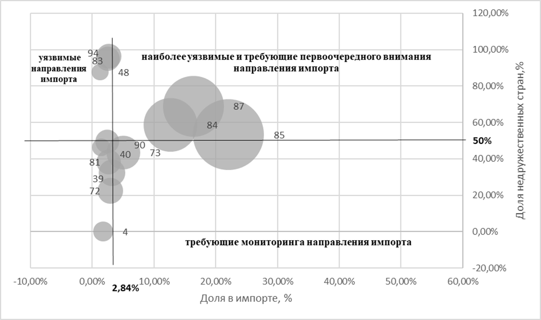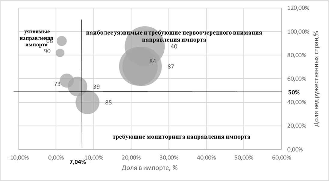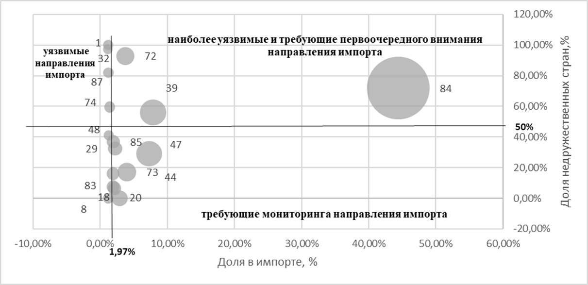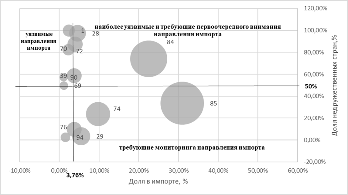 Сопоставив значения долей в импорте региона и долей поставок ТНВЭД из недружественных стран, на рисунках 2-15 представлены наиболее уязвимые направления в разрезе ТНВЭД. По данным направлениям в первую очередь необходимо активизировать политику импортозамещения, выбрав одну из подходящих стратегий: альтернативные поставки из зарубежных стран, альтернативные поставки из иных субъектов РФ, располагающими потенциалом к импортозамещению поставок, разворачивание локальных видов производств с учетом имеющегося ресурсного потенциала.