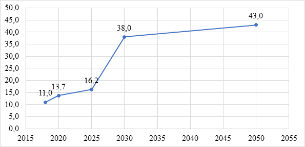 Эмпирика подтверждает структурный характер сдвига: в возобновляемой энергетике было 11,0 млн рабочих мест в 2018 г., 13,7 млн – в 2022 г. и 16,2 млн – в 2023 г. В сценарии удержания потепления на уровне 1,5 °C к 2030 г. ожидается рост до 38 млн, с дальнейшим увеличением до 43 млн к 2050 г. Траектория отражает ускоренный ввод солнечных и ветровых мощностей, расширение производственных и логистических цепочек, модернизацию сетей и распространение накопителей энергии (рис. 1).