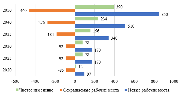 Таким образом, краткосрочные балансы чувствительны к конъюнктуре и могут быть отрицательными, в прогнозе до 2030 г. совокупное создание рабочих мест по линии ИИ-диффузии и «зеленой» модернизации, как правило, превосходит вытеснение. При этом прогнозы Всемирного экономического форума (ВЭФ) после 2030 г. показывают, что верхняя граница сценарного коридора для стресс-тестов: простая экстраполяция чаще завышает эффект из-за насыщения рынков и ограничений предложения труда.