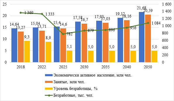 Прогноз математически согласован: при целевом уровне безработицы 5,0% расчетные занятые и безработные соответствуют объему трудовых ресурсов. Для достижения целей нужно ускорить чистое создание рабочих мест в 2024–2030 гг. до 0,40 млн в год, после 2030 г. – плавное снижение темпа до 0,20 млн. Такая двухфазная траектория реалистична при синхронизации «зеленых» и цифровых инвестиций с подготовкой кадров и локализацией цепочек поставок (рис. 3).