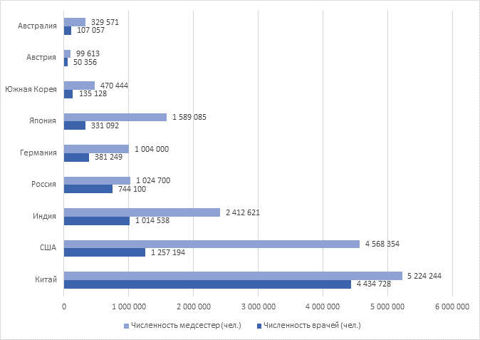 Обеспеченность врачами в России находится на высоком уровне (51,1 на 10 000 населения), что превышает показатели США (36,8), Австралии (40,9) и Японии (26,5). Однако анализ структуры персонала выявляет критическую проблему – диспропорцию между врачами и медсестрами.