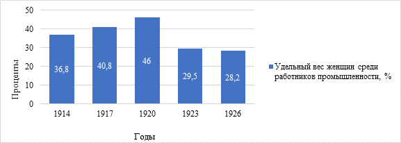 Рисунок 1. Удельный вес женщин среди работников промышленности в России в 1914–1926 гг.
