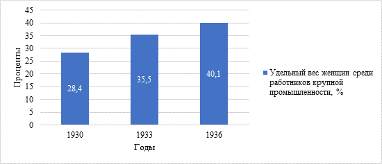 Рисунок 2. Удельный вес женщин среди работников крупной промышленности в России в 1930–1936 гг.