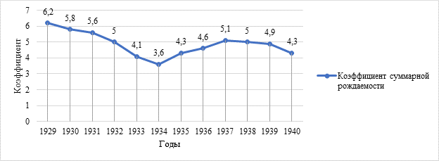 Рисунок 3. График изменения коэффициента суммарной рождаемости в России за 1929–1940 гг.