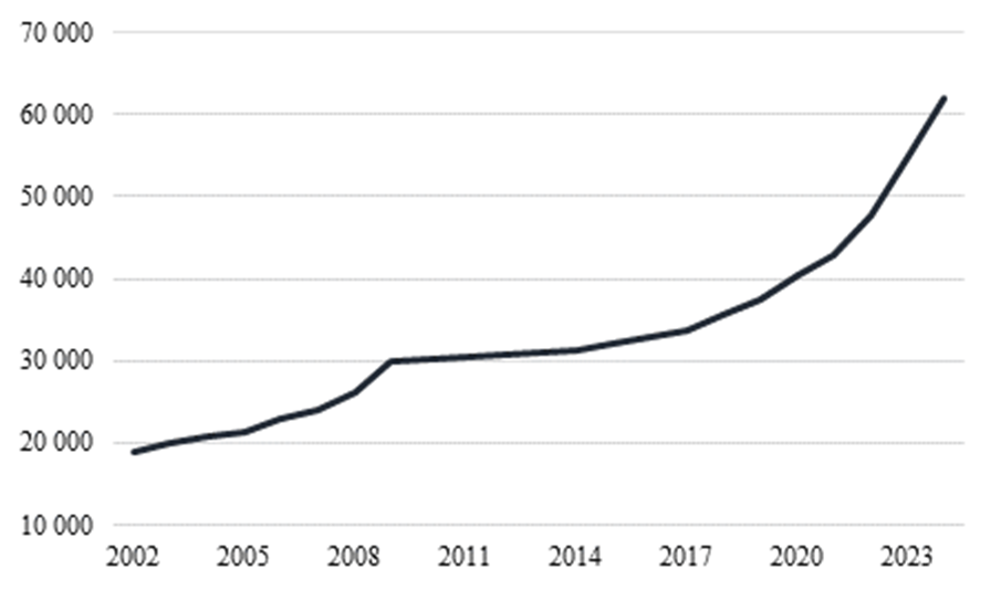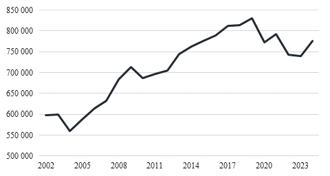 Figure 1. Total number of people employed, 2002–2024, ppl.