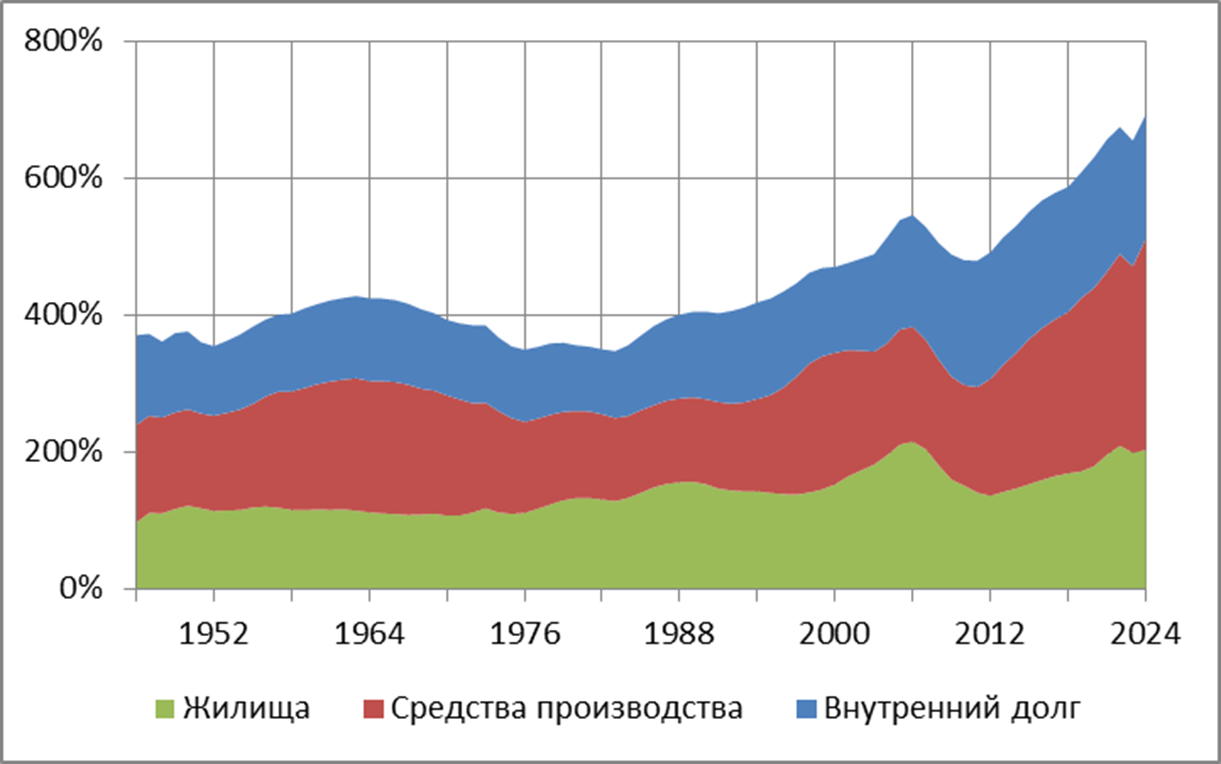 Но имеется один важный нюанс: устойчивые соотношения между указанными категориями за весь современный период это такое же временное явление, как и стабильность середины XX века. Так, ещё в 20-е годы, при том же совокупном значении в 400% от ВВП на внутренний долг приходилась только одна шестая часть капитала против почти одной трети после войны и сейчас, а средства производства решительно опережали жилища за счёт земли и других активов в сельском хозяйстве. Такой результат получается после соответствующей пересборки балансов Р. Голдсмита и Р. Липси [10] (Goldsmith, Lipsey, 1963). Корреляция не означает закономерности, а равновесие это миг перед очередным сдвигом.