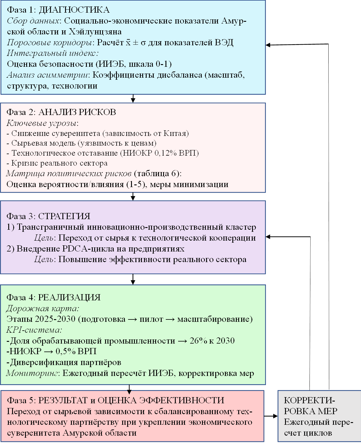 Логика исследования реализована через комбинированную процедуру, включающую три ключевых этапа. На этапе диагностики использован комплексный подход, включающий количественную оценку показателей относительно пороговых значений, статистический анализ допустимых диапазонов их изменений и интегральную оценку уровня безопасности. Этап сравнительного анализа и оценки асимметрии включал количественное сопоставление параметров двух регионов, расчёт коэффициентов дисбаланса и качественный контент-анализ институционально-политических факторов для верификации гипотезы. На этапе синтеза и проектирования управленческих решений разработан прикладной инструментарий: алгоритм четырёхфазного цикла управления рисками, матрица политических рисков и дорожная карта с KPI для реализации механизмов трансграничного кластера и внедрения PDCA-цикла.