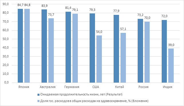 Данные таблицы 1 позволяют сделать вывод, что Россия демонстрирует парадоксальную ситуацию: доля государства в структуре расходов (70%) соответствует уровню развитых социальных государств (Германия, Австрия), однако показатель ожидаемой продолжительности жизни (ОПЖ) (73,2 года) существенно отстает от эталона (80+ лет).