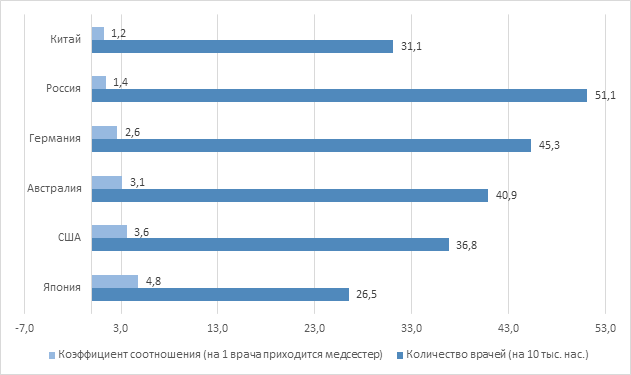 В свою очередь, таблица 2 и рисунок 2 демонстрируют «операционный риск»: в России ставка сделана на существенно более затратный врачебный, а не на более дешевый средний персонал, что парадоксальным образом оказывается финансово неэффективным.