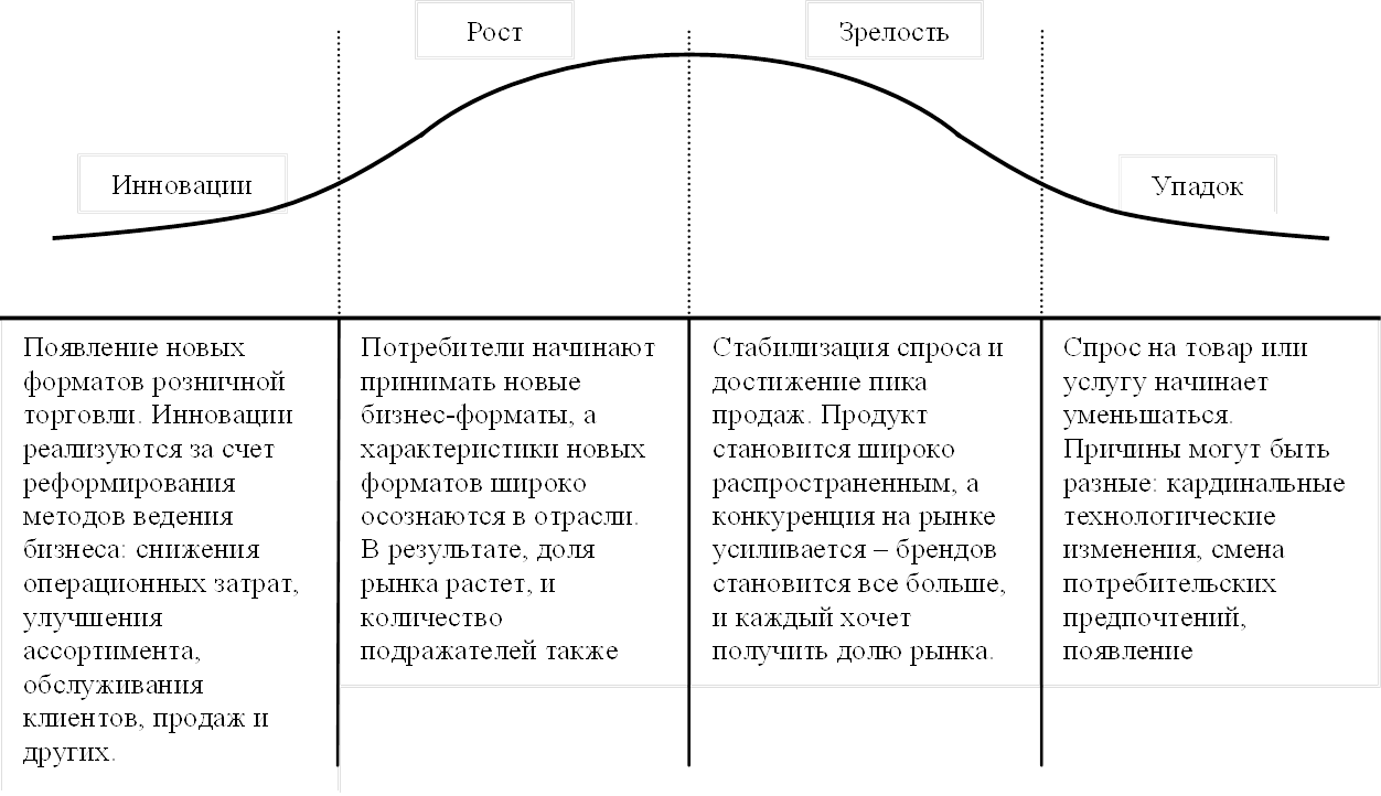 С учетом рассматриваемых периодов розничная торговля включает четыре этапа развития, которые представлены эпохами – древности, средневековья, новым временем и современностью (рис. 2), а также фазами жизненного цикла – инновации, роста, зрелости и упадка (рис. 3). Современная теория жизненного цикла утверждает, что российская розничная торговля переживает цикл, аналогичный жизненному циклу продукта. Однако стоит учитывать, что реальный жизненный цикл розничной торговли может отличаться от теоретической схемы – у каждого продукта индивидуальный жизненный цикл.