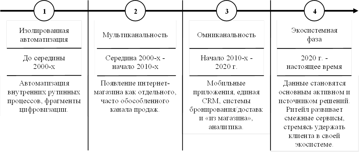 Эволюция российского ритейла в этом направлении прошла несколько этапов, каждый из которых обусловлен развитием цифровых технологий и изменениями в поведении потребителей (рис. 4).