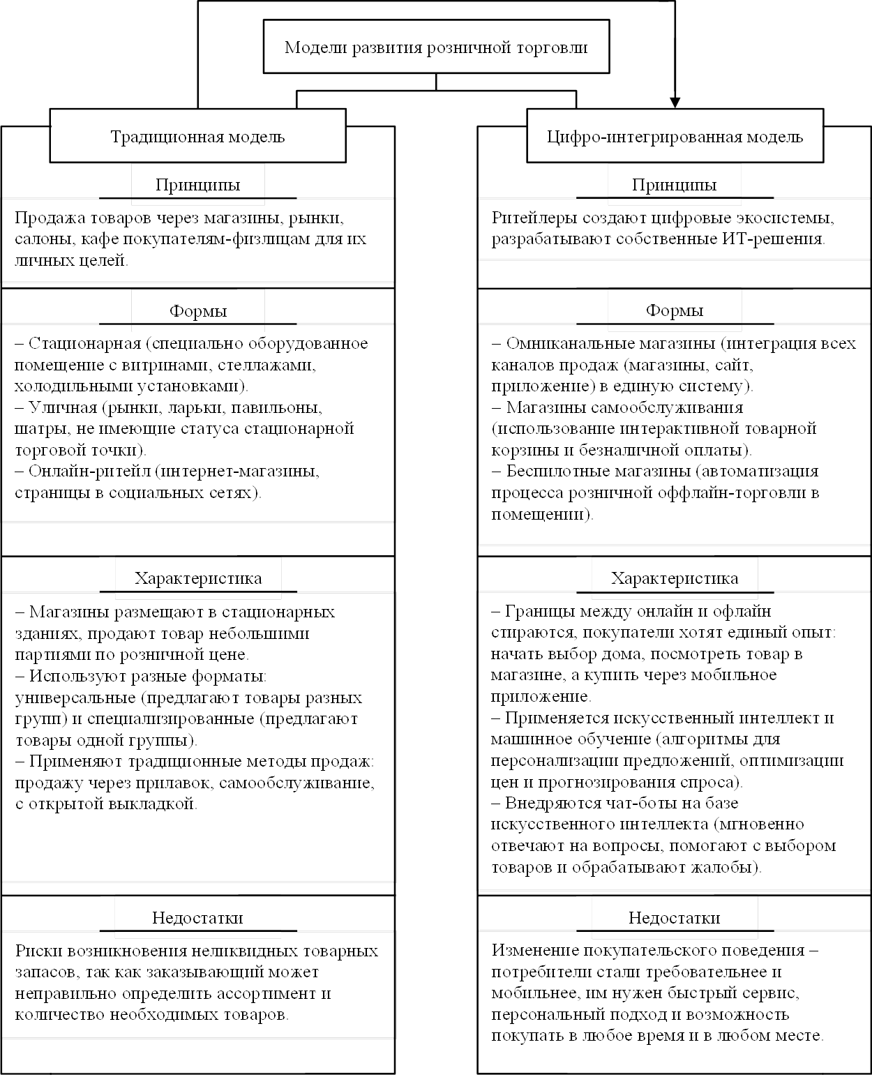 Розничная торговая сеть, эволюционируя от традиционной к цифро-интегрированной модели, имеет свои специфические особенности. Традиционная модель розничной торговой сети основана на физических магазинах, предлагающих широкий ассортимент товаров, а цифро-интегрированная модель сочетает элементы традиционной розничной торговли и электронной коммерции (рис. 5).