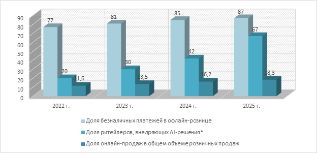 Глубину произошедших изменений иллюстрируют количественные показатели. Динамика ключевых метрик за последние четыре года демонстрирует не просто рост, а структурный сдвиг. Это подтверждает, что розничные торговые сети инвестируют не просто в «онлайн-продажи», а в цифровую инфраструктуру будущего (рис. 6).