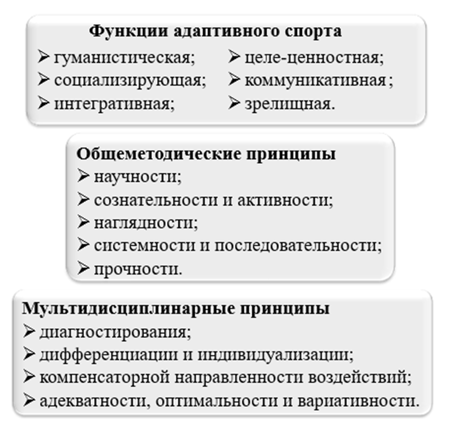 Для общества это означает «ломку» стереотипов и продвижение концепта инклюзивности, организацию эмоциональной поддержки спортсменов. Для самих спортсменов – особенно в спорте высших достижений – это формирование аутентичной системы мотивации, овладение зрелыми копинг-стратегиями, осознание своих возможностей и расширения ментальных моделей [3]. На рис.1 представлены основные функции и принципы адаптивного спорта.
