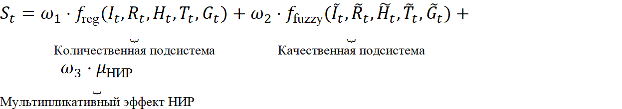 w_1, w_2, w_3 — весовые коэффициенты количественного, качественного и инновационного компонентов модели соответственно (рекомендуемые значения: 0,4; 0,3; 0,3).