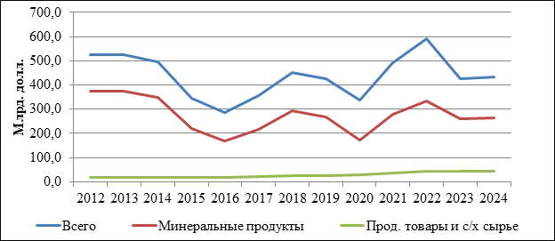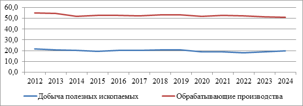 Рисунок 11. Динамика валовой добавленной стоимости по отраслям добычи полезных ископаемых и обрабатывающих производств и в целом по РФ в 2012-2024 гг.