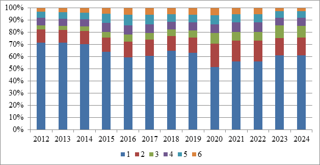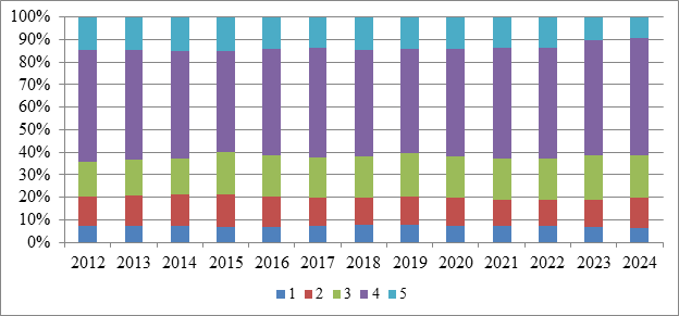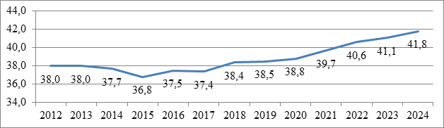 Рисунок 8. Динамика доли машин и оборудования в общем объеме основных фондов в отрасли сельского хозяйства в 2012-2024 гг.