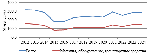 В первый санкционный период наблюдалось снижение доли машин и оборудование на 1,2 п.п. Однако уже в 2022 году, после вторичного введения санкций в отношении России их доля увеличилась и достигла 41,8% в 2024 году, что сигнализирует о повышении технологичности отрасли.