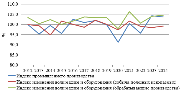 Рисунок 10. Динамика индекса доли машин и оборудования в общем объеме основных фондов по отраслям добычи полезных ископаемых и обрабатывающих производств и индекса промышленного производства в 2012-2024 гг.