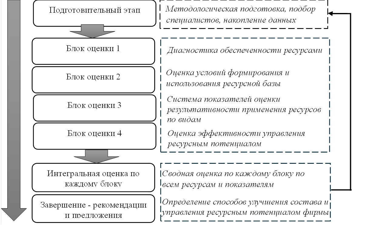 - четвертый блок оценки – оценка эффективности принимаемых решений по управления ресурсным потенциалом и его развитию в рамках фирмы.