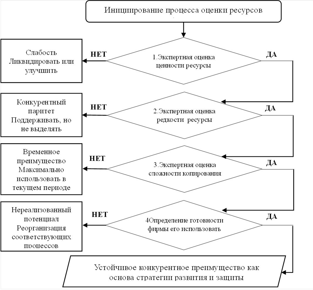 - оценку возможностей, которые получает фирма при доступе к соответствующему объему, качеству, разнообразию ресурсной базы и компетенций по ее использованию в своей экономической деятельности;