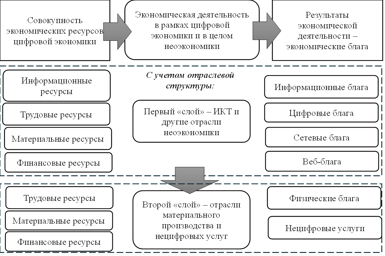На рис.1 представлена характеристика экономической деятельности в ее традиционном определении как преобразование экономических ресурсов в экономические блага за счет применения технологий. В контексте цифровой экономики представлена многослойность новой экономики (неоэкономики) с первичностью «слоя» видов экономической деятельности, обеспечивающих создания информационных и других благ цифровизации.