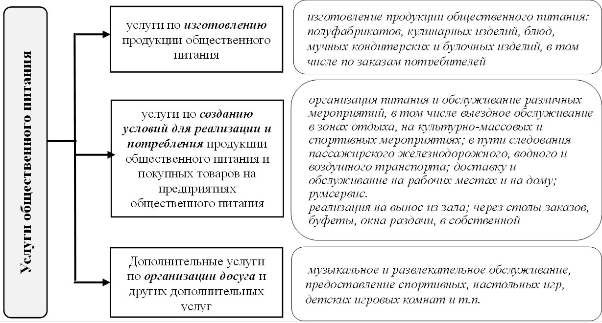 В отличие от предприятий пищевого обрабатывающего производства и предприятий торговли предприятий общественного питания одновременно занимаются производством кулинарной продукции, ее реализацией и организацией потребления (включая организацию и обслуживание торжеств, услуги по организации досуга, проката посуды и т.п).