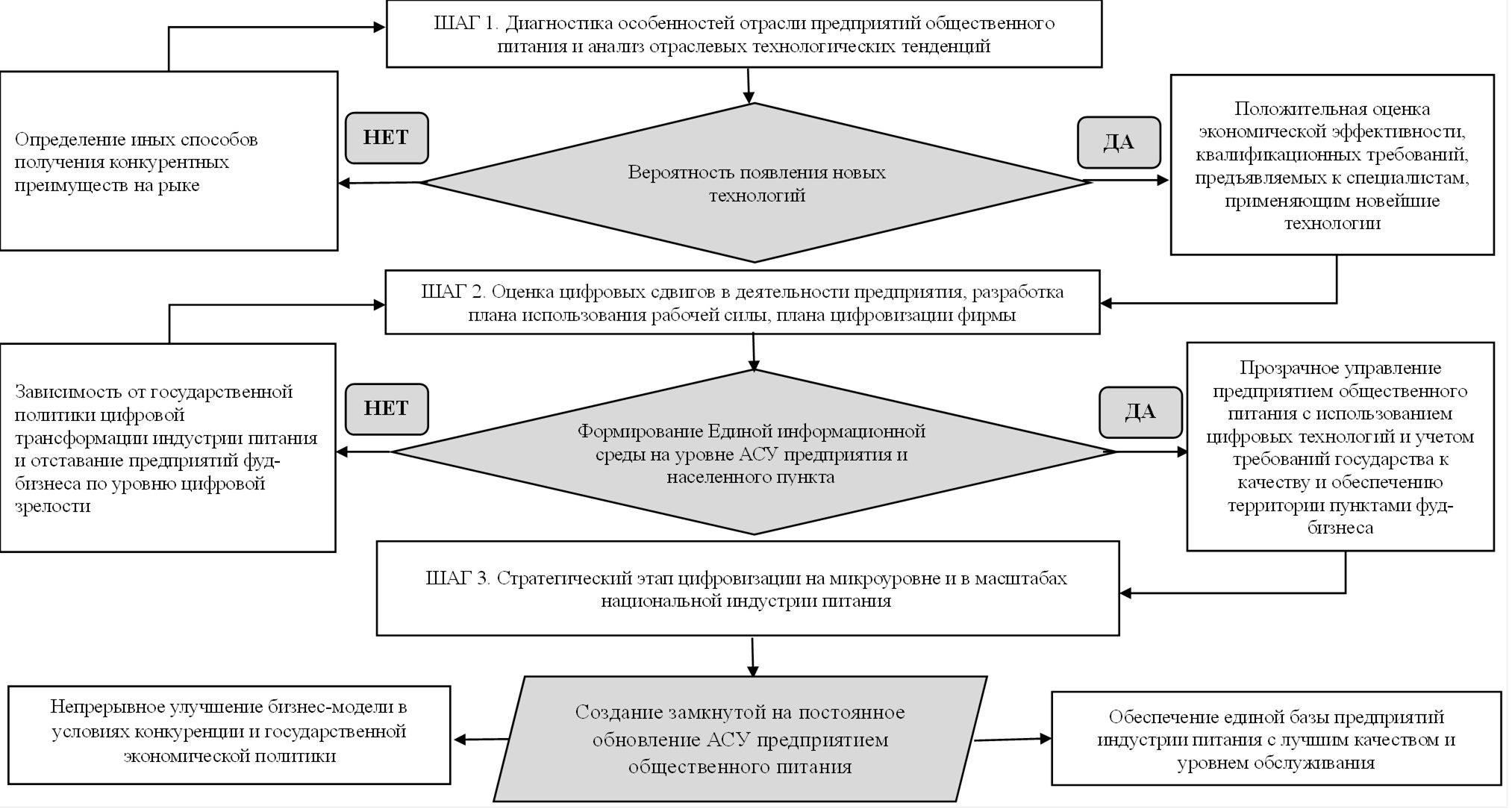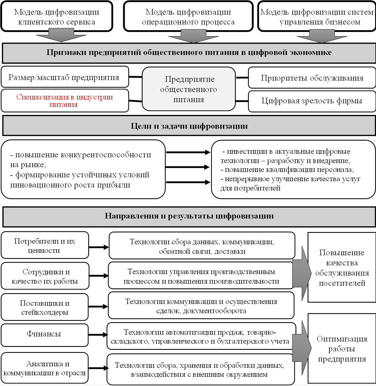 Тенденции в развитии неоэкономики и цифровой экономики в мире и в России свидетельствуют о необходимости детального подхода к определению условий и особенностей процессов цифровизации, с которыми сталкиваются участники экономической деятельности и государство. Накопленные опыт и результаты исследований эволюции постиндустриальных экономических систем позволяют акцентировать внимание на такой сложной экономической деятельности, как индустрия питания, ядром которой выступают предприятия общественного питания в широком определении.