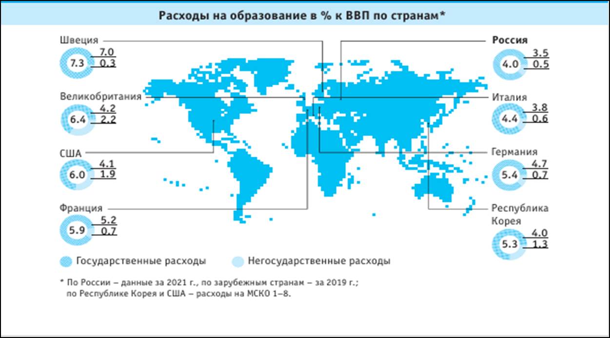По расходам на образование в % к ВВП Российская Федерация уступает Швеции, более чем 1,8 раза, Великобритании в 1,6 раза, США и Франции в 1,5 раза, Германии и Южной Кореи в 1,4 раза, и Италии на 10% [13]. При этом, по доле негосударственных расходов к ВВП Российская Федерация сегодня превышает Швецию в 1,7 раза.