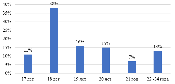 Также наибольшую активность в опросе приняли студенты в возрасте 18 лет (38%), что свидетельствует об активном интересе первокурсников к цифровому виду спорта, который необходимо сохранять и стимулировать.Исследования показывают, что средний возраст киберспортсмена или геймера существенно различается по региона.