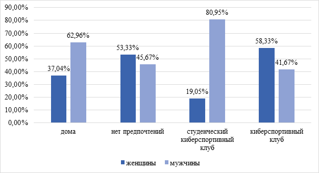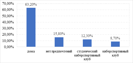 Результаты опросы показали, что 63,2% студентов выбрали домашние условия, что может свидетельствовать, как о личностных особенностях игроков, так и о непривлекательности киберспортивной зоны в образовательной организации.