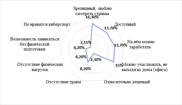 16,3 % опрошенных опять же отмечали его зрелищность, 13,70 % отметили доступность и 15 % удобство участия в соревнованиях (не выходя из дома), 13,7 % выбрали материальную причину возможности заработать на киберспорте.
