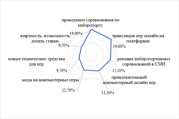 13,3% опрошенных прогнозируют популярность киберспорта через развитие компьютерого дизайна игр, 196% выбрали трансляцию игр, 19, 9% проведение соревнований, 15,10% рекламу в СМИ киберспорта. Тенденция роста массовости и зрелищности будет стимулировать интерес подростков к онлайн игровому процессу, что можно использовать при организации воспитательной и молодежной политике в Вузе.