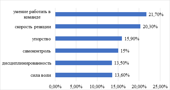 Деятельность формирует навыки и умения. Киберспортивная деятельность, по мнению, 21,7% опрошенных укрепляет способность работать в команде, 20, 30% считают, что она развивает скорость реакции. 15,9% уверены, что формирует упорство, 15 % отдали предпочтение самоконтролю. 13,5% - дисциплинированность, 13,6% - силе воли. Эти качества являются важным дополнением в формированию поведенческих установок молодых людей, как успешных и работоспособных сотрудников для будущих работодателей.