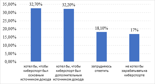 Также важным вопрос по исследованию поведенческих установок молодежи было определение интереса к киберспорту, как к будущей профессии [6].