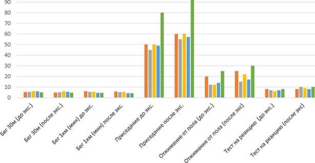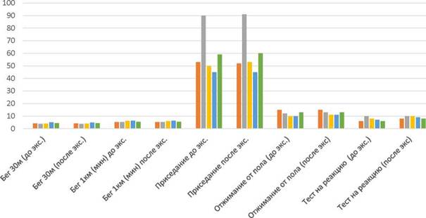 Показатели выполнения тестовых упражнений по группам тестируемых после проведения эксперимента представлены в таблицах.