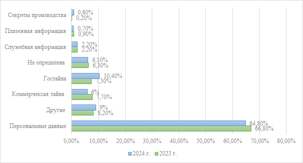 Рисунок 3 – Распределение утечек информации по типам скомпрометированных данных в РФ за 2023 – 2024 гг. (составлено автором по [20])