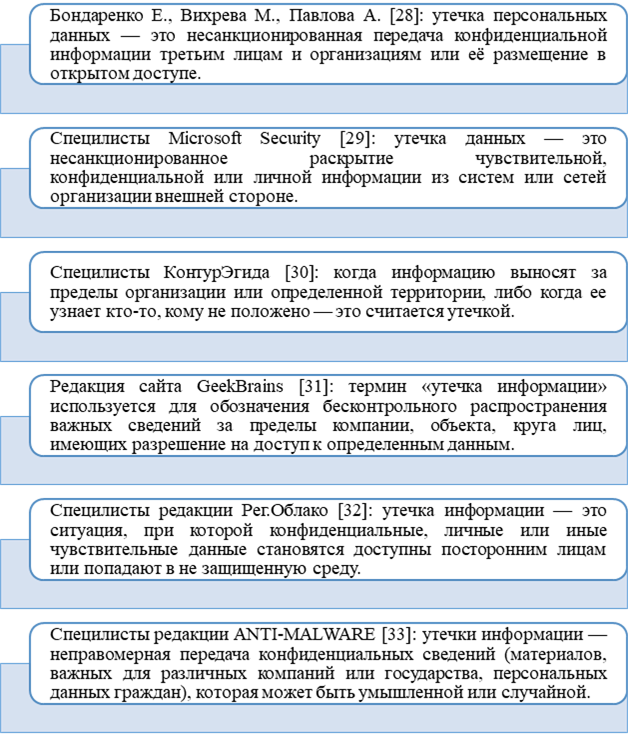 Рисунок 5 – Авторские трактовки понятия утечки информации (данных) (составлено автором по [28-33])