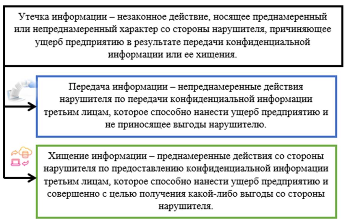 Изучая понятийный аппарат важно отметить, что в настоящее время нет нормативных документов, которые бы регламентировали дефиницию утечка информации. Существует множество авторских трактовок, единственная попытка определиться с терминологией отмечена в Банком России в Рекомендациях в сфере стандартизации Банка РФ «Обеспечение информационной безопасности организаций банковской системы РФ» в части утечки информации, где в пункте 3.2. утечка информации рассматривается как несанкционированное предоставление или распространение информации конфиденциального характера, не контролируемое организацией банковской сферы РФ [23]. Также в рекомендациях отмечено, что распространение информации предполагает ее передачу неизвестным лицам (неопределённым), а в случае с предоставлением это уже происходит в адрес определённого круга лиц. По мнению автора и в том, и в другом случае присутствует умысел, но меняется лишь круг лиц и понимание кому она уйдет, но не отражен факт нанесения ущерба. Также в рекомендациях определены понятия доступа информации, защита от утечки, дано понятие информации конфиденциального характера, также определён термин возможный внутренний нарушитель и владелец информационного актива. Стоит отметить, что все определения даны с учетом особенностей банковской сферы и это отражено в каждом определении, что вполне закономерно, ведь ЦБ РФ регулирует работу банковского сектора нашей экономики.