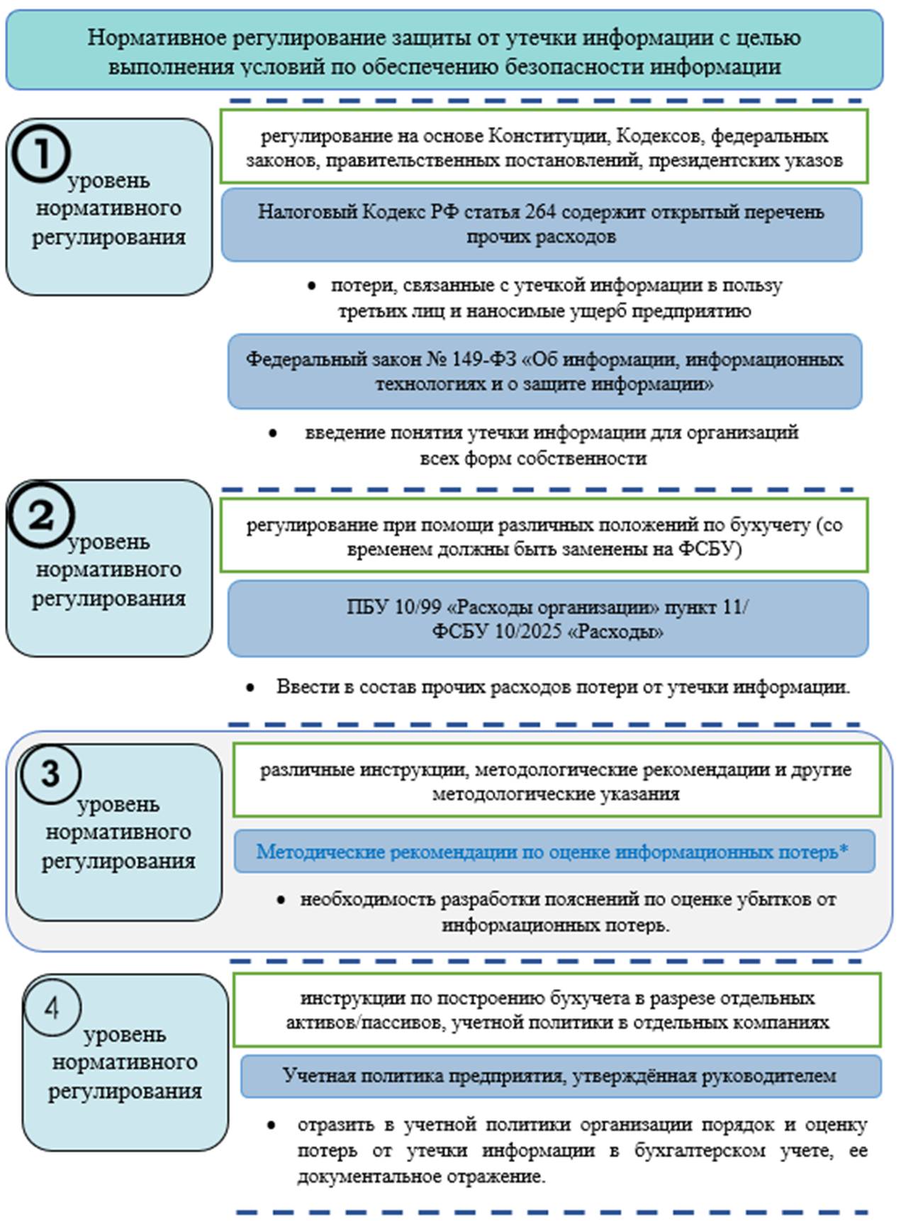 Вместе с формированием определения утечки информации возникает необходимость отражения данного понятия на всех уровнях нормативного регулирования, что даст возможность оценивать экономический ущерб от такого действия (рис.7). На данный момент данное понятие является скорее разговорным, несмотря на повсеместную цифровизацию и распространённость в экономической среде в том или ном виде, масштабе. Внесение уточнений в нормативные документы необходимо вносить начиная с первого уровня, так, в можно его внести в Закон №149- ФЗ, а также в НК РФ расширить перечень расходов в целях налогообложения налога на прибыль. Это позволит адаптировать содержание нормативных документов к условиям цифровизации, которые предполагают не только траты денежных средств на информационные услуги по обеспечению безопасности информационных ресурсов, но и компенсацию потерь от утечки информации. Это явление стало повсеместным, как неотъемлемое условие цифровизации, сколько бы не существовало способов защиты информации, всегда со стороны мошенников будут изобретены методы обхода средств безопасности.
