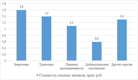 За время проведения СВО было национализировано более 100 стратегически важных компаний, обеспечивающих безопасность государства, с активами более 6 трлн. руб. (рис. 1). Эти компании осуществляют деятельность в следующих сферах: энергетика, транспорт, пищевая промышленность, обрабатывающая промышленность, недвижимость и ОПК. Основанием для национализации послужили антикоррупционные нарушения, вывод прибыли за границу, деприватизация и экстремизм. При этом, следует отметить, что большое количество дел по изъятию активов в пользу государства не содержат данных о стоимости активов, например, в области сделок с недвижимостью и в сфере обрабатывающей промышленности.